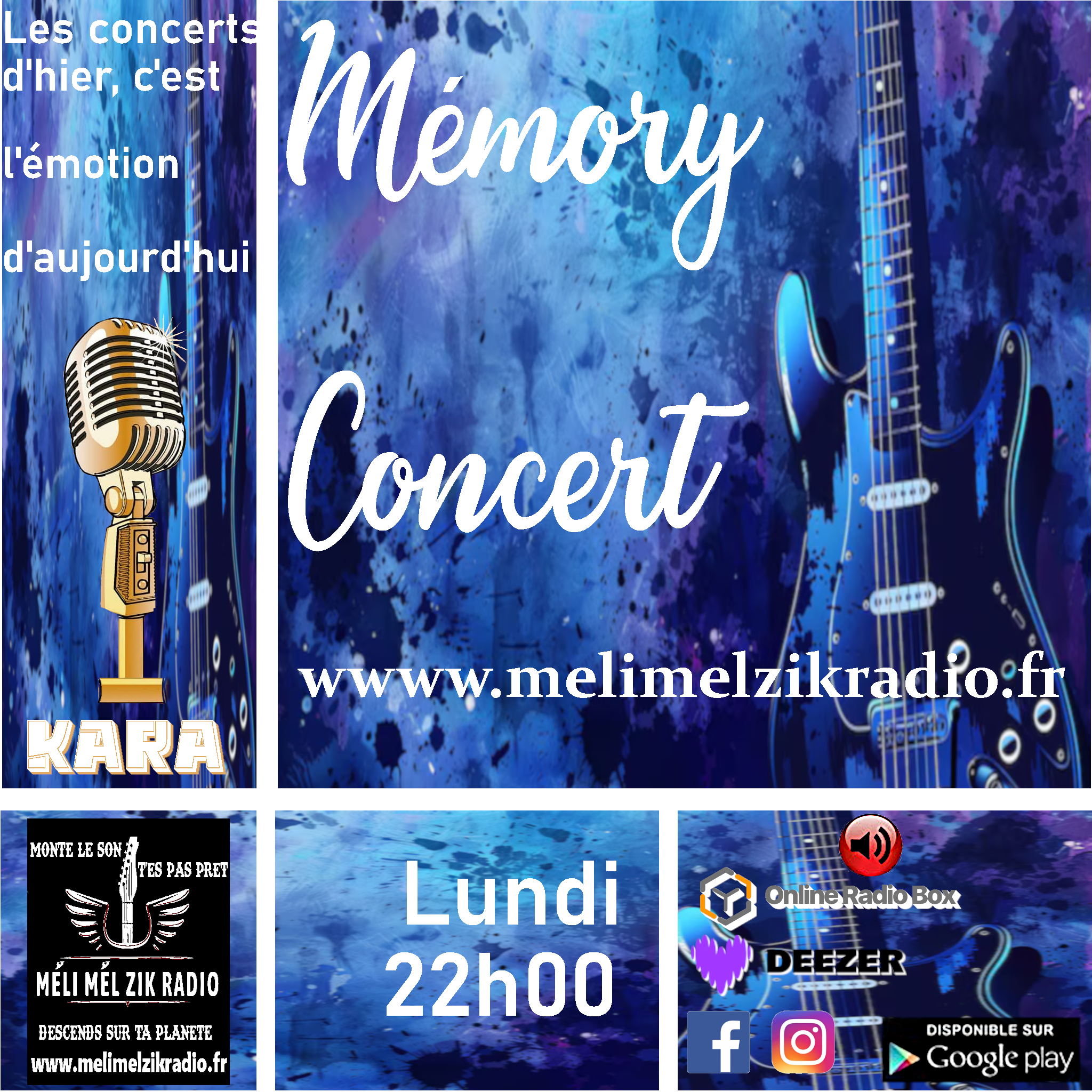 MEMORY CONCERT tous les lundis soirs à partir de 22h00 c'est la mémoire des concerts enregistrés qui font revivre la scène…en effet les concerts passent, l’émotion reste et les souvenirs s’écoutent....sur MELI MEL ZIK RADIO